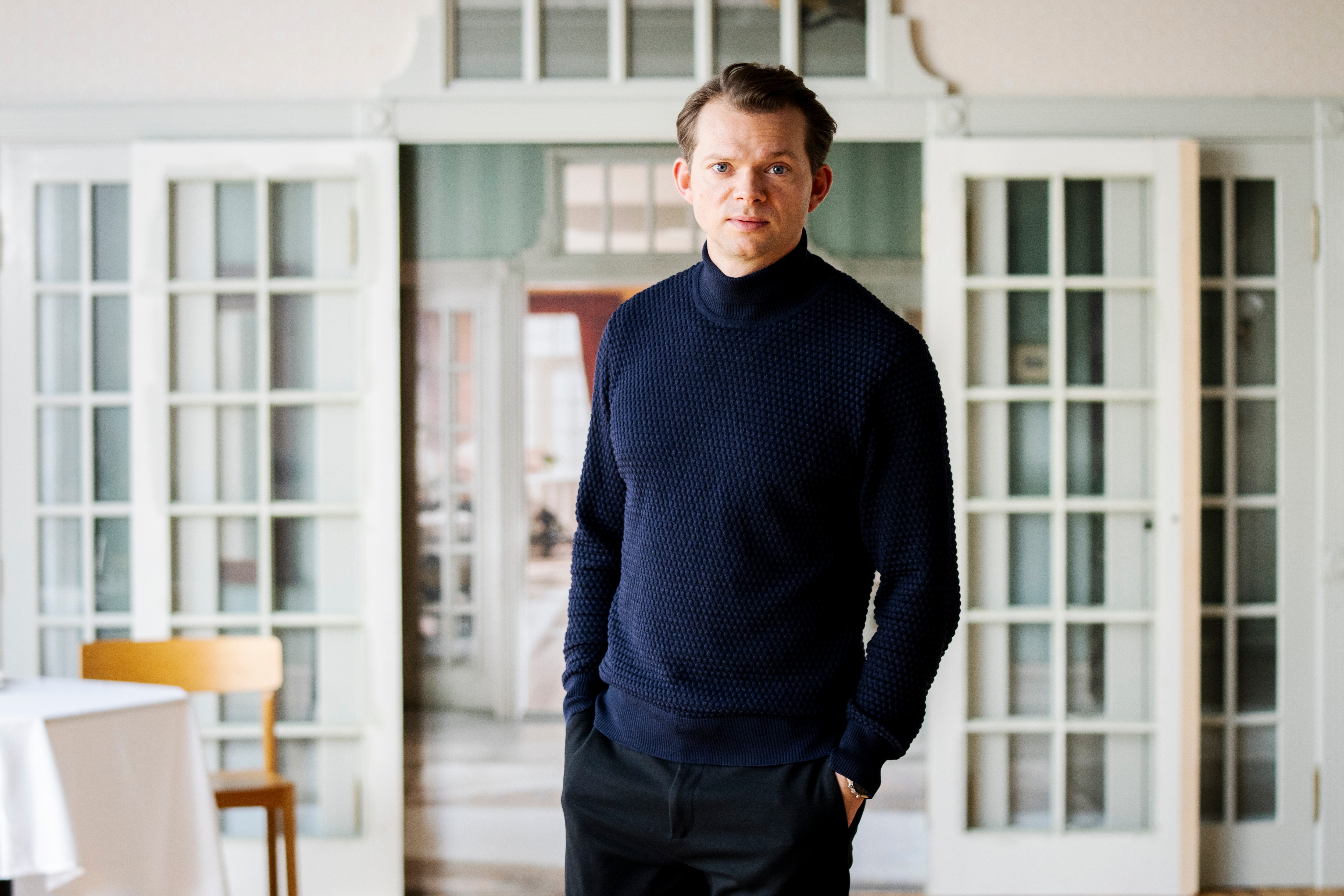 Sigurd Holmen le Dous på et pressemøde i anledning af den nye sæson af Badehotellet på TV2 i København, onsdag den 21. februar 2024. Sæsonen er den 10. og sidste i serien.. (Foto: © Ida Marie Odgaard, Ritzau Scanpix)